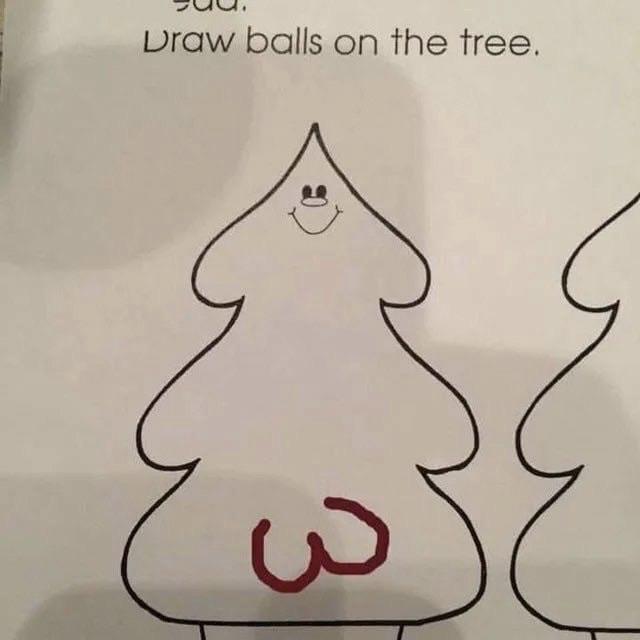 Al pequeño se le pidió que dibujase bolas en un árbol de Navidad. El niño colocó las bolas donde él consideraba que tenían que estar: donde se ubican los testículos.