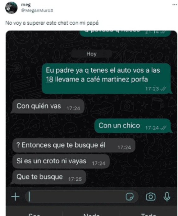 “Eu padre, ya que tenés el auto a las 18, llévame a Café Martínez por favor” comenzó la charla, la joven que dio a conocer la conversación, el padre le preguntó con quién iba a ir y ante la respuesta “con un chico”, la impactante respuesta asombró a todos: “Entonces que te busque él, si es un croto ni vayas, que te busque”, sostuvo.