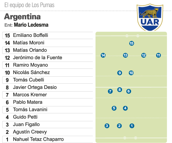De estos dos rivales peligrosos, claramente los galos son los más "accesibles". Para ese juego inicial fundamental, Ledesma paró ayer en el arranque de la semana lo que será el quince titular. Y su apuesta en la formación pasa por la base de los Jaguares que disputaron la final del Super Rugby cayendo ante Crusaders. Solo dos nombres no dirán presente y serán reemplazados por un par de rugbiers que se desempeñan en Europa. En la primera línea, sale Santiago Medrano e ingresa Juan Figallo, buscando una mayor solidez en el scrum, una formación que en los últimos tiempos trajo muchos dolores de cabeza. Es una faceta clave teniendo en cuenta que a partir de la salida de la guinda se puede generar desequilibrio en la defensa adversaria. Históricamente Los Pumas se hicieron fuertes ahí, pero con Ledesma en la conducción la historia no pudo ser tan favorable. La otra modificación respecto al partido en Christchurch pasa por un puesto fundamental: el apertura. Sin Joaquín Díaz Bonilla (el 10 de Jaguares) por decisión técnica, ese lugar será para Nicolás Sánchez, de pobres rendimientos en el Championship pese a lo cual el coach confía en recuperarlo. Quedará relegado al banco otro de los "preferidos" de Ledesma: Benjamín Urdapilleta.