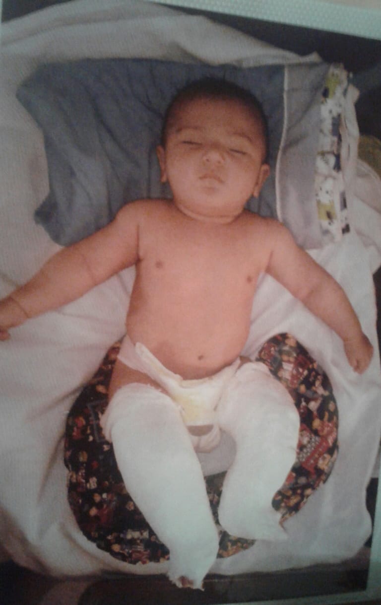 La pelea por tener una mejor calidad de vida no finaliza ahí, ya que a 15 días de haber nacido, debieron enyesarle las piernas por una malformación que presentaba en sus piecitos y cada semana le cambiaban los yesos. Secuencia que se repitió durante tres meses hasta que lo operaron y ahora continúa con su tratamiento durmiendo con zapatos especiales para enderezar sus extremidades.