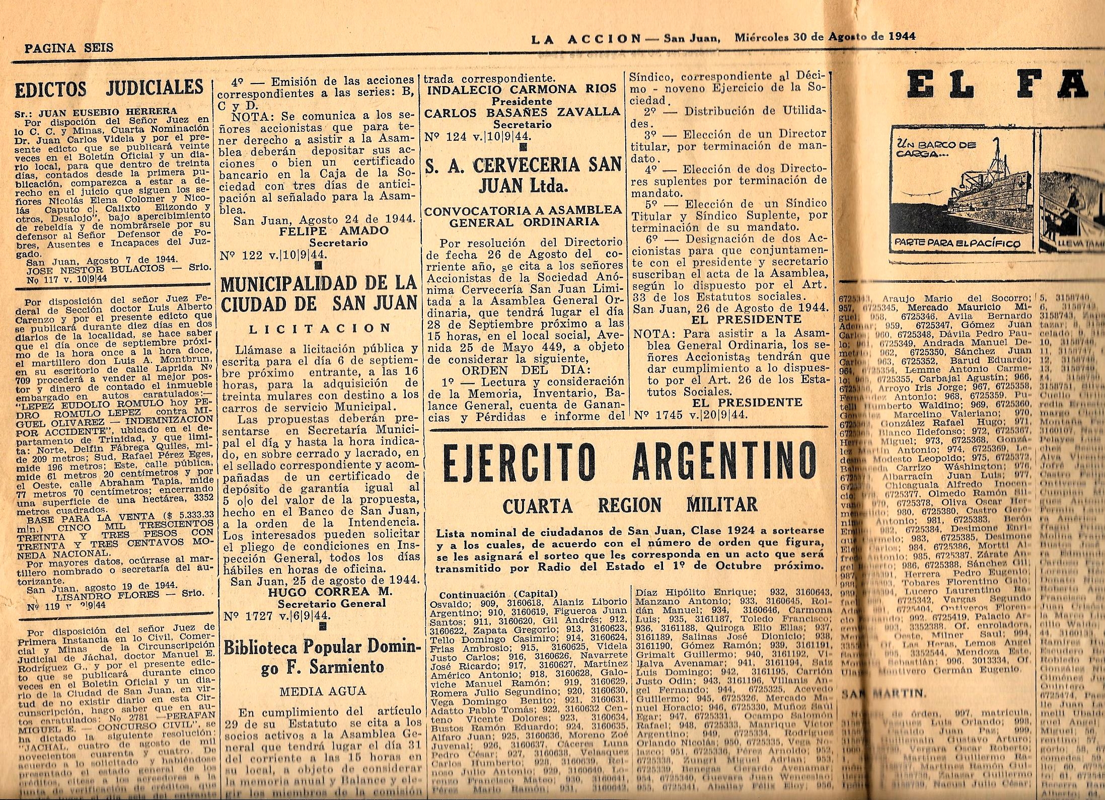 Diario "La Acción”, San Juan 30 de agosto de 1944 – Municipalidad de la Ciudad de San Juan.
