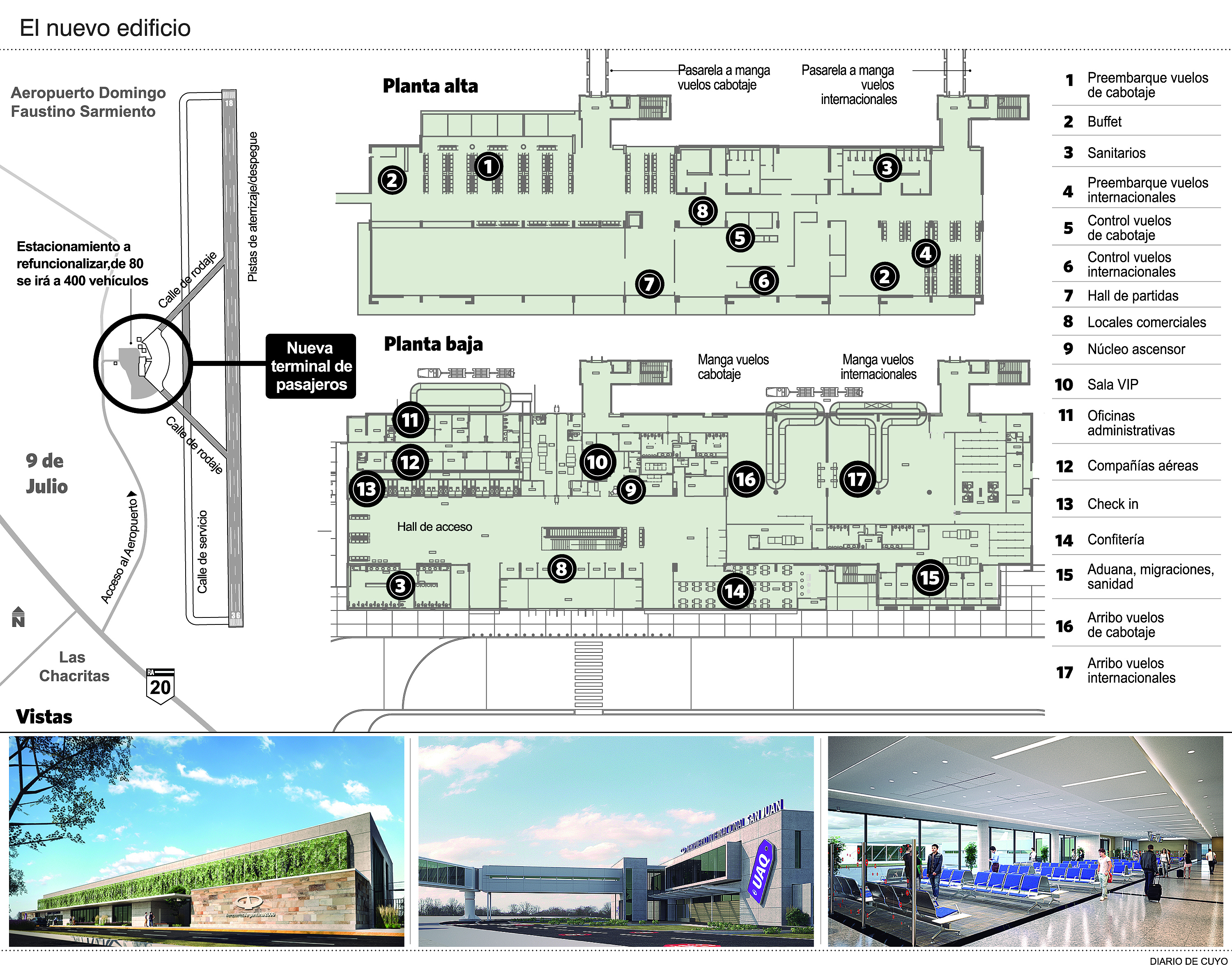 Una obra largamente esperada por los sanjuaninos, como la remodelación integral del Aeropuerto Domingo Faustino Sarmiento, tendrá dos plantas y contará, entre otras comodidades, con un ascensor de última tecnología, 3 cafeterías y 2 mangas, una para vuelos de cabotaje y la otra para los internacionales, para que los pasajeros puedan acceder directamente desde el edificio hasta el avión que deben abordar. Un paso clave en ese proceso tendrá lugar el 21 de agosto, porque hasta esa fecha se podrán presentar las ofertas para participar en la licitación de los trabajos en el edificio que, con algunas lavadas de cara, data de 1964.