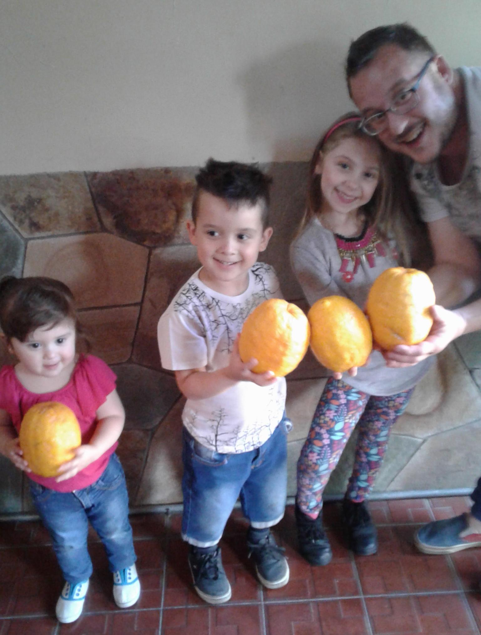 El fruto de nuestra tierra no deja de sorprender. En un domicilio particular en la localidad de Alto de Sierra, Santa Lucía, un limonero entrega frutos gigantes. La planta de 22 años de edad, fue traída desde Valle Fértil, localidad con historia en el cultivo de cítricos. En la foto, los niños Eleonora, Bautista y Renata junto al señor Alejandro Gastón Sánchez, sostienen frutos 890, 825, 790 y 870 gramos.