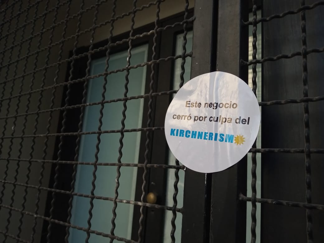"Este negocio cerró por culpa del kirchnerismo", rezan las pegatinas que aparecieron durante las últimos días en locales céntricos de la provincia que, en varios casos, debieron bajar sus persianas por la crisis. Los stickers forman parte de una curiosa campaña, de autor anónimo y desconocido.