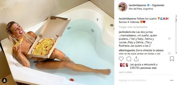 Sol Pérez llegó a los cuatro millones de seguidores en Instagram de la mano de su carisma y sus fotos con poca ropa. Para festejar esta cifra, publicó una foto donde se encuentra en una bañera y está comiendo pizza dentro de ella, pero se le escapó un detalle.
