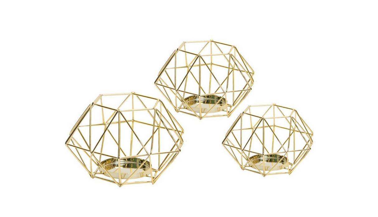 Utiliza porta velas, geométricos, octogonales, de metal, en tonos dorados, champagne, plateados y hasta blancos, dependiendo del color con el que ya se cuenta en el ambiente.