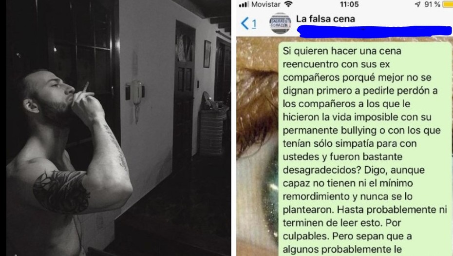 "Si quieren hacer una cena reencuentro con sus ex compañeros por qué mejor no se dignan primero a pedirle perdón a los compañeros a los que le hicieron la vida imposible con su permanente bullying", comienza el texto que el joven oriundo de La Plata envio en el grupo “La falsa cena”.