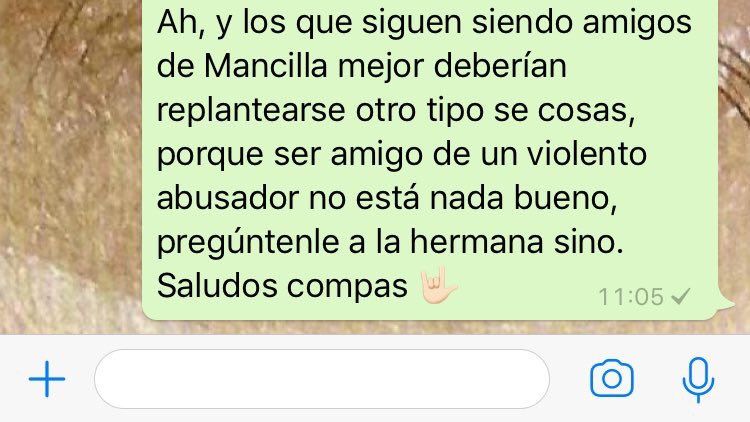 Antes de terminar, les dejó un mensaje especial para los amigos de un tal “Mancilla”. "Deberían replantearse otro tipo de cosas, porque ser amigo de un violento abusador no está nada bueno, pregúntenle a la hermana sino. Saludos compas", cerró y se marchó del grupo.