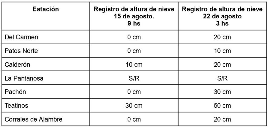 De acuerdo a lo informado por el Departamento de Hidráulica, de las 6 estaciones meteorológicas que están entregando datos, en todas hubo caída de nieve. Son registros de las 3 de la mañana de hoy y, comparados con el último (15 de agosto), muestra novedades.