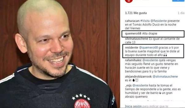 René Pérez Joglar, más conocido como René de Calle 13, vivió un episodio incómodo del que salió airoso gracias una jocosa respuesta. "Alta drapie", le escribió un hincha de Huracán, luego de que el club destacara la presencia del cantante puertorriqueño en la derrota de Huracán ante Arsenal del viernes.