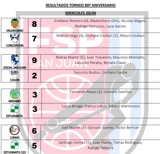 En la noche del miércoles se abrió la sexta fecha del torneo que homenajea los 80 años de la Federación Sanjuanina de Patín y Lomas venció por 6-5 a Estudiantil Sub-23 para convertirse en el único líder provisorio del hockey sobre patines masculino hasta que juegue UVT este viernes. Además, Valenciano derrotó 8-7 a Concepción y es escolta.
