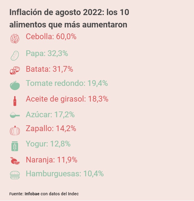 Entre los 10 alimentos que más aumentaron figura el kilo de cebolla, con un alza de 60% en agosto, seguido por el kilo de papa, con un incremento de 32,3 por ciento. En tanto, completó el podio el kilo de batata, con una suba en el sexto mes del año de 31,7 por ciento.