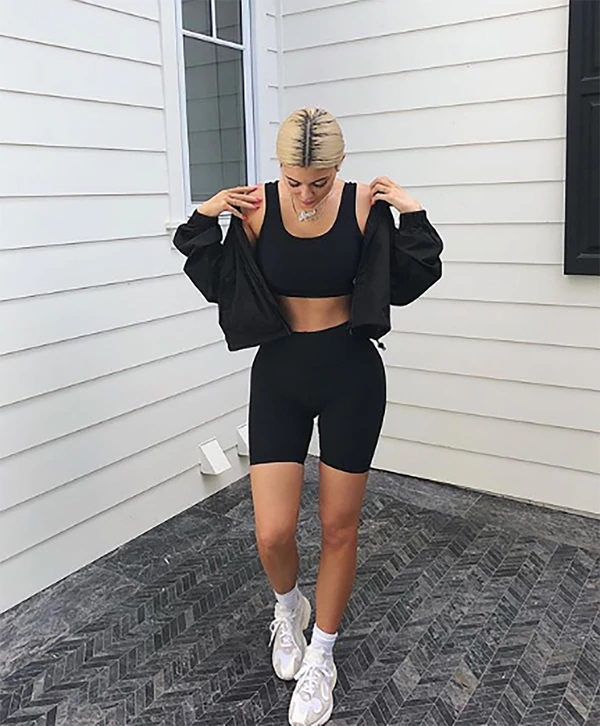 Kylie Jenner, una de las hermanas que integran el clan Kardashian-Jenner, tampoco se pierde esta tendencia del biker short. Más clásica y deportiva, en su guardarropa lo tiene en negro y de cintura alta.