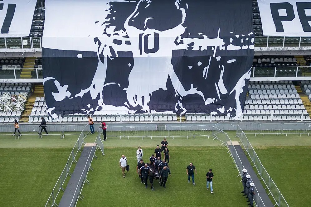 Los restos de Pelé, cuyo cuerpo pasó por un proceso de embalsamamiento llamado taxopraxia. fueron colocados debajo de una tienda en el centro del campo del Santos, el club donde jugó desde 1956 hasta 1974 ganando dos copas Libertadores y dos Intercontinentales.