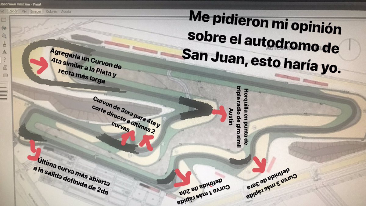El arrecifeño realizó una publicación con una foto en la que muestra los cambios que le haría al circuito del Villicum. Pidió cambios en varios sectores para que el espectáculo sea mejor. Hoy a la mañana gente de San Juan, se comunicó conmigo y me pidio mi opinión, para hacer algunos cambios sobre el nuevo circuito albardonero.