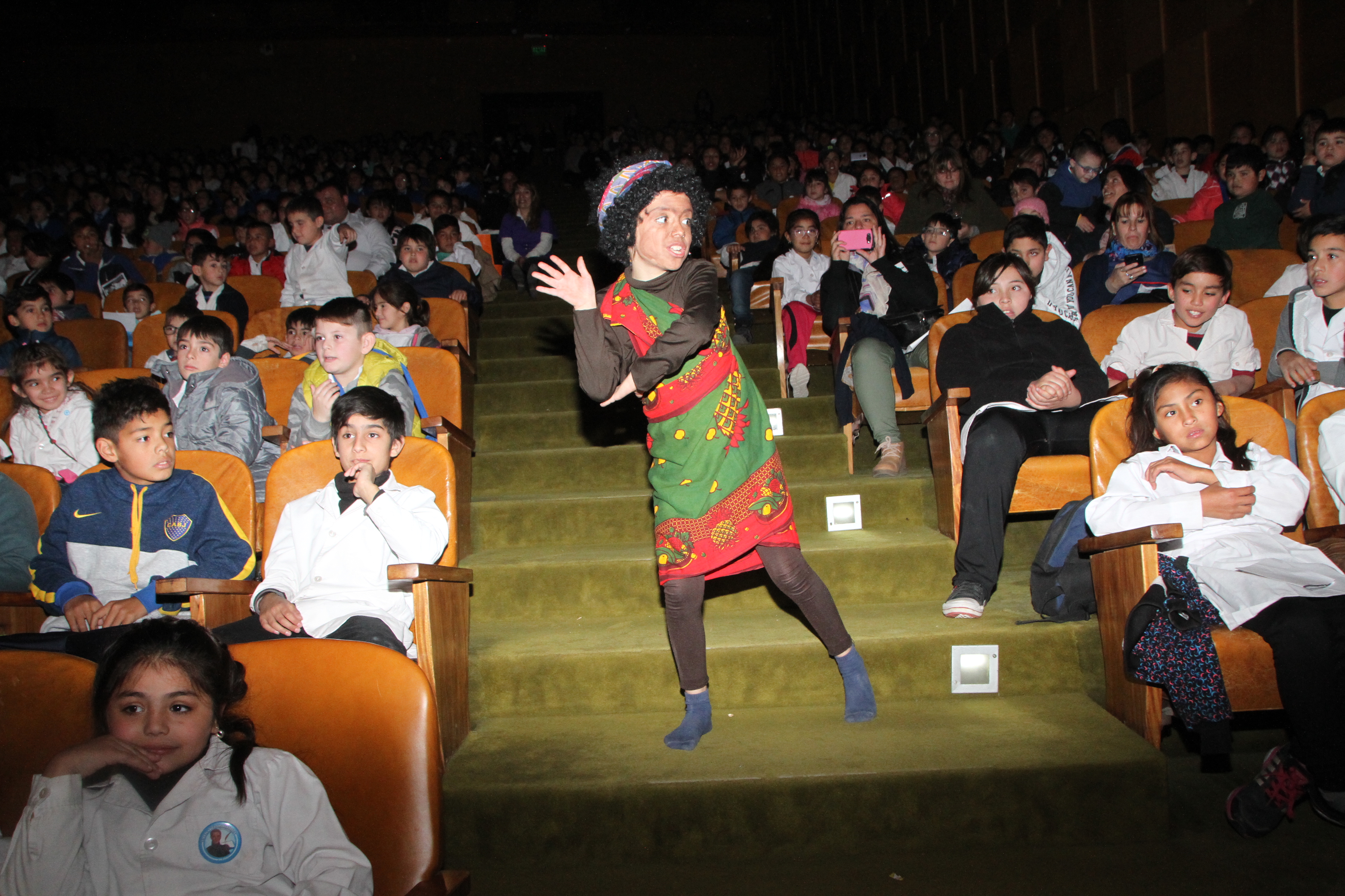 Mantusha, el personaje principal de la canción tradicional africana, se pasea en las escaleras animando a los demás chicos en sus butacas.