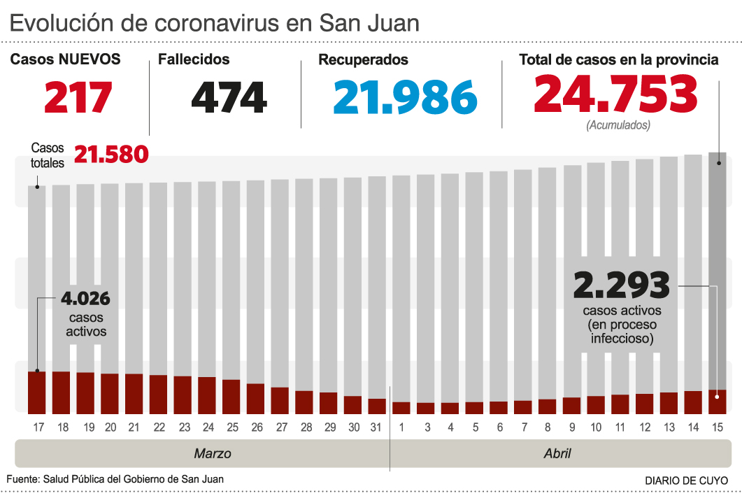 Tres hombres, de 81; 70 y 75 años, murieron a causa de Covid y de esta manera los fallecidos en San Juan suman 474; en tanto que con 217 nuevos casos, el acumulado de infectados ahora es de 24.753.