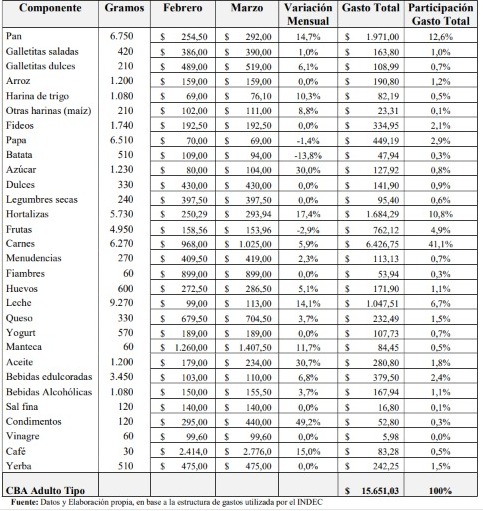 Los porcentajes son tomados, el función de un relevamiento de los precios de los 30 ítems que componen la Canasta Básica Alimentaria (CBA), durante la 2° y 4° semana de cada mes, tomando como referencia marcas reconocidas del medio, y tratando de evitar las promociones y los productos tipo “Premium”, a los efectos de reflejar lo que demanda una familia tipo, de clase media.