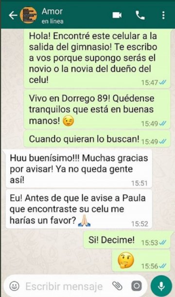 Una serie de capturas si viralizó en lo que parece ser la conversación entre un chico que encontró un celular a la salida de un gimnasio y el novio de quien perdió el teléfono.