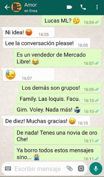 Lo rato del caso es que quien habría encontrado el aparato promete borrar la conversación para que ella no se entere pero publicó las capturas. De todos modos, el lector pasará un rato divertido leyendo la preocupación del joven porque ella habla con alguien que él no conoce y el alivio posterior.