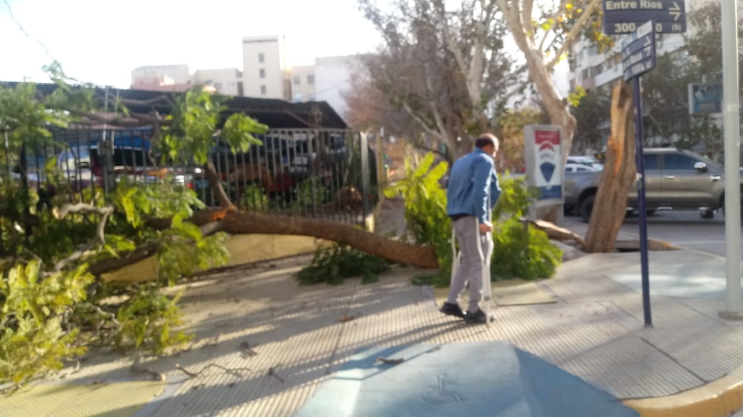 Rama de dimensiones peligrosas cayó en pleno centro, justo frente a un estacionamiento privado y cortó un cable. Intersección de Avenida Ignacio de la Roza y Entre Ríos, Capital.
