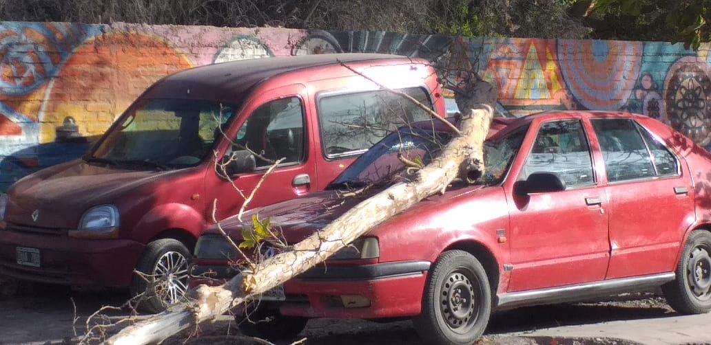 Una rama impactó de lleno en un Renault 19. Ocurrió en Sarmiento y Balaguer, Santa Lucía.