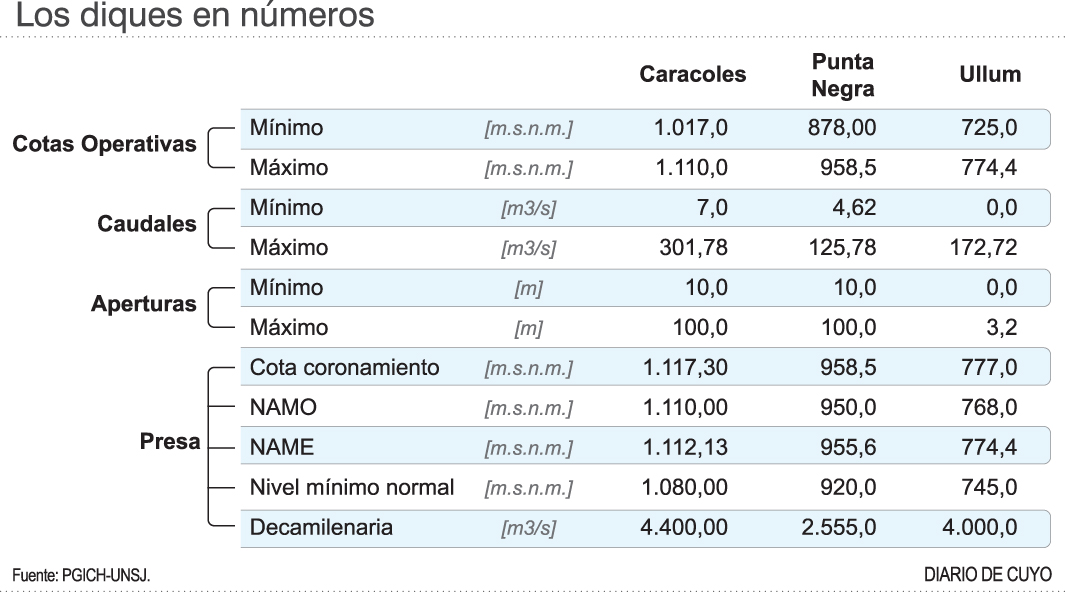 Ahora en este último artículo sobre el tema, Dölling nos explica la situación de cada una de las tres presas escalonadas, donde alerta: "Hoy el embalse Los Caracoles está muy por debajo de su cota operativa mínima normal. Hoy está en 1.033 metros sobre el nivel del mar -msnm- aproximadamente, con sólo unos 23 hm3 almacenados".