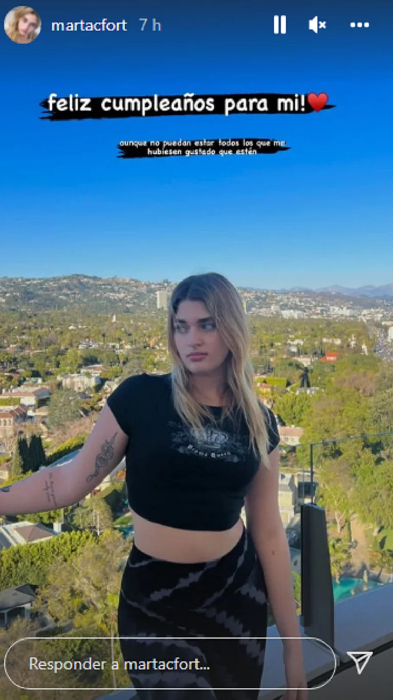 “¡Feliz cumpleaños para mí!”, escribió Marta Fort en su cuenta de Instagram en lo que fue la primera foto que publicó en su regreso a la red social desde que murió Gustavo Martínez, quien fuera su tutor y quien se arrojó desde el piso 21 del edificio del barrio de Belgrano en el que vivía con los hijos de Ricardo Fort. Antes, había posteado un video desde la terraza del exclusivo hotel en el que se hospeda por estos días junto a su hermano en Beverly Hills, a donde viajaron para celebrar sus 18 años.