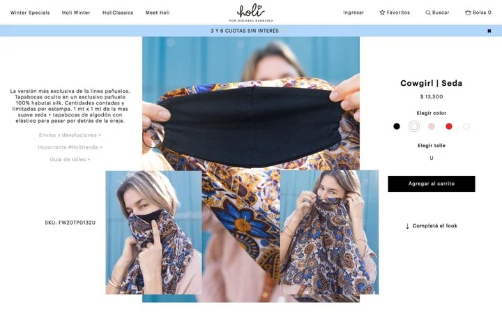 Así, la versión de tapabocas "cowgirl", hecho de seda, se ofrece a un precio de 13,500 pesos y es el más caro de todos. "1 metro x 1 metro de la más suave seda + tapabocas de algodón con elástico para pasar por detrás de la oreja", explica su descripción oficial.