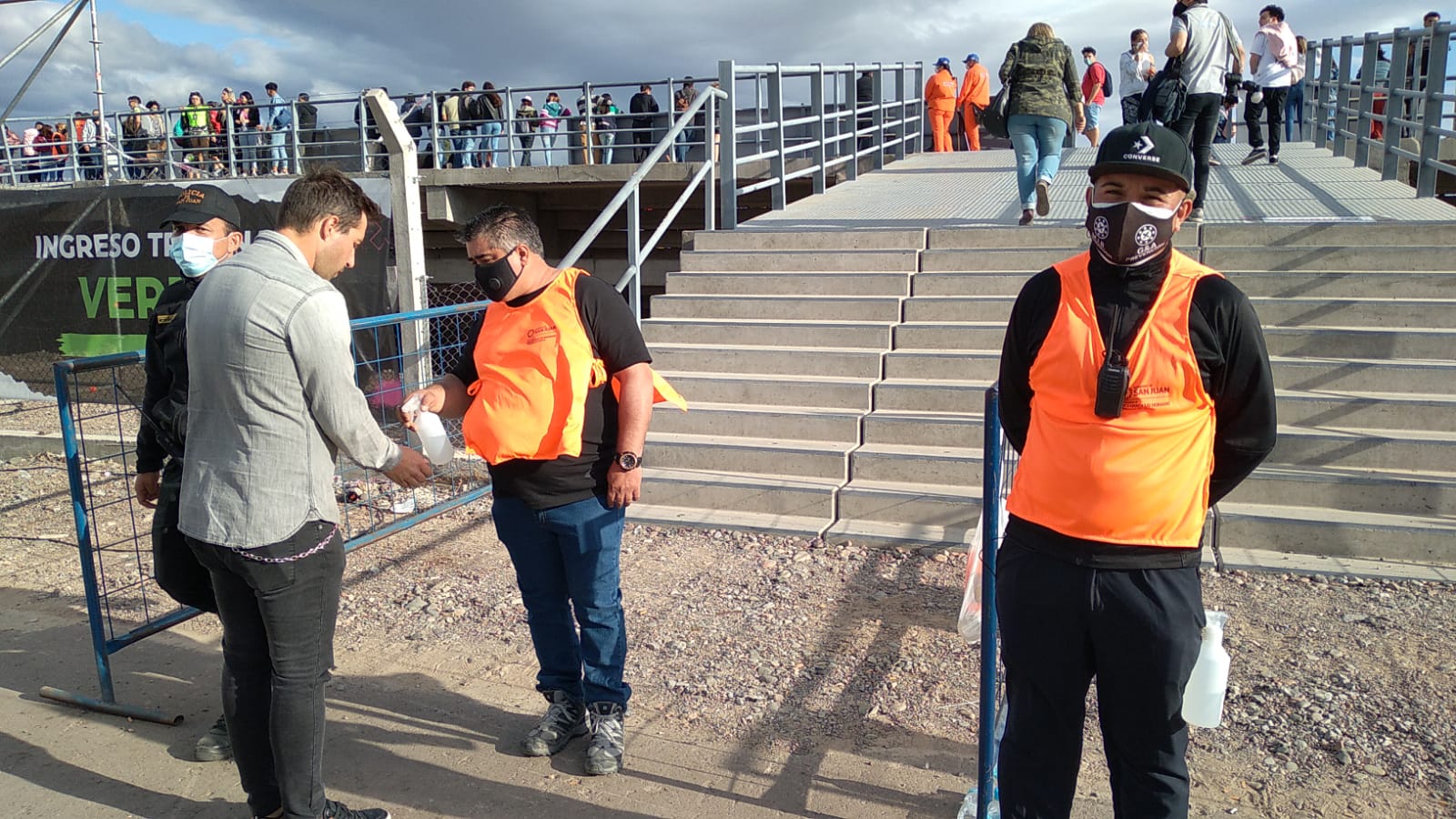 En todas las entradas del autódromo hay personas que colocan alcohol en las manos del público.