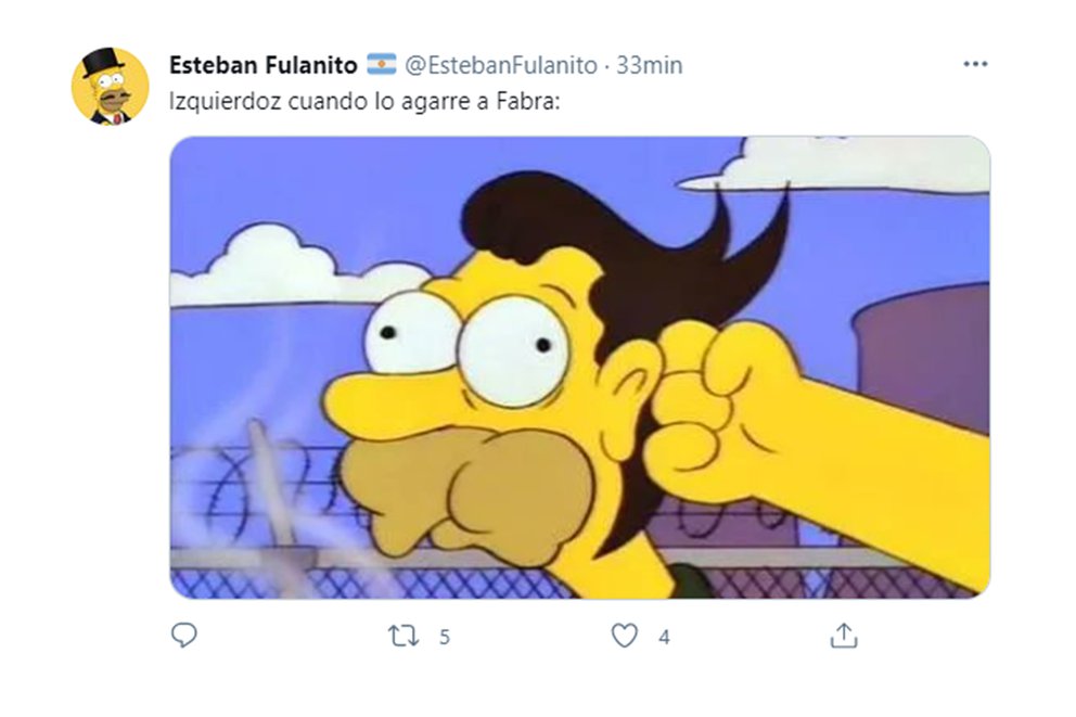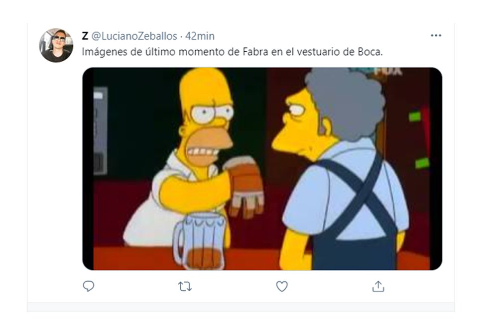 “¿Qué pasó en el vestuario durante el entretiempo?”, fue el tópico más abordado. Con Los Simpsons como protagonistas de los memes, muchos aventuraron una venganza sin cámaras del áspero marcador central, mientras que otros vieron una pelea estilo UFC, sin reglas ni árbitros; ni siquiera con Miguel Ángel Russo como mediador.