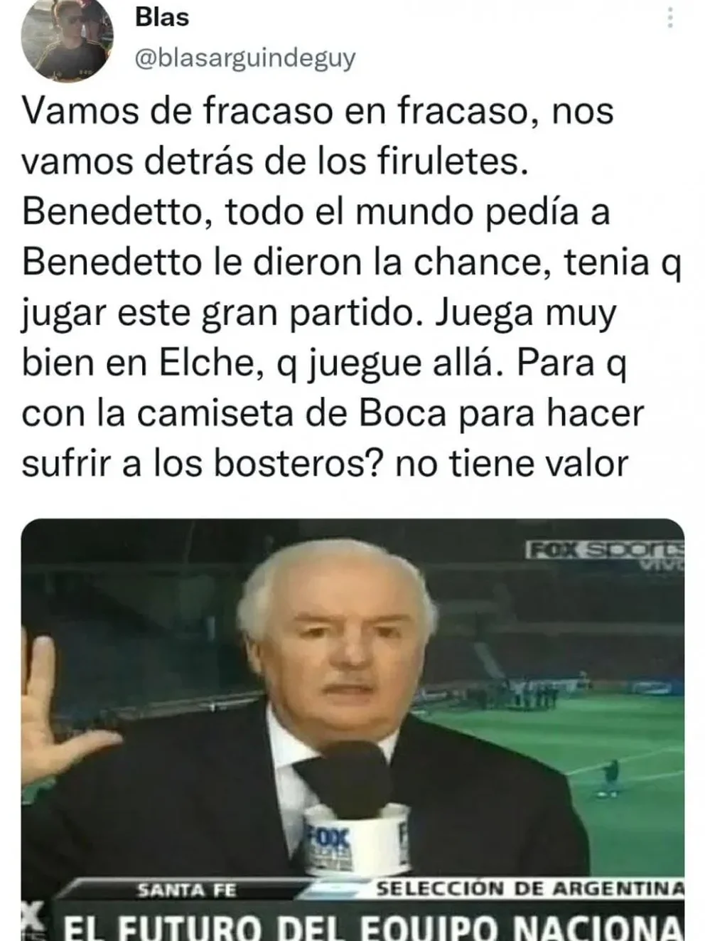 Por eso, en las redes sociales explotaron los memes contra Benedetto e incluso muchos le pusieron un nuevo apodo al Pipa: Memedetto. Lo cierto es que el delantero, máximo goleador del Xeneize desde el retiro de Martín Palermo, ostenta cifras espectaculares: 57 goles en 100 presentaciones con la camiseta azul y oro. Pero ante Corinthians tuvo su peor encuentro.