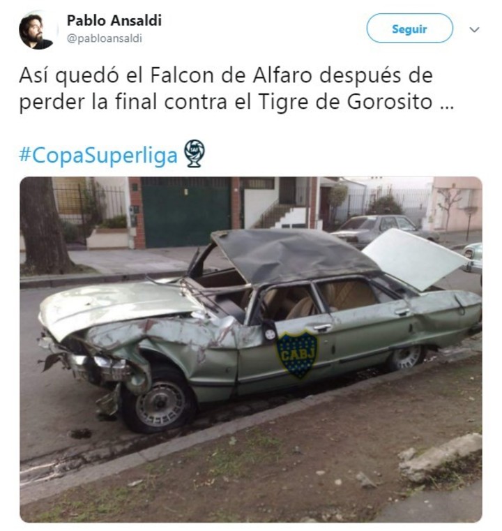 Tigre se consagró campeón de la primera edición de la Copa Superliga al derrotar a Boca, 2 a 0, en un encuentro disputado en el estadio Mario Alberto Kempes de Córdoba. Tras la inesperada caída de Boca, las redes sociales se inundaron rápidamente de memes, las tradicionales "cargadas" que llevan algo de originalidad y que hicieron foco en Pipa Benedetto, Esteban Andrada y Gustavo Alfaro, principalmente.