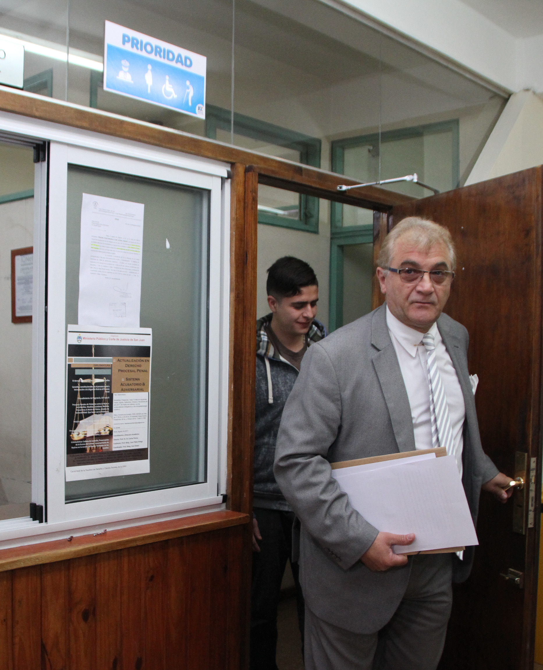 Denuncia. Falcón y su defendido, Merino, saliendo del Primer Juzgado Correccional, donde trabaja el secretario del Jurado de Enjuiciamiento.