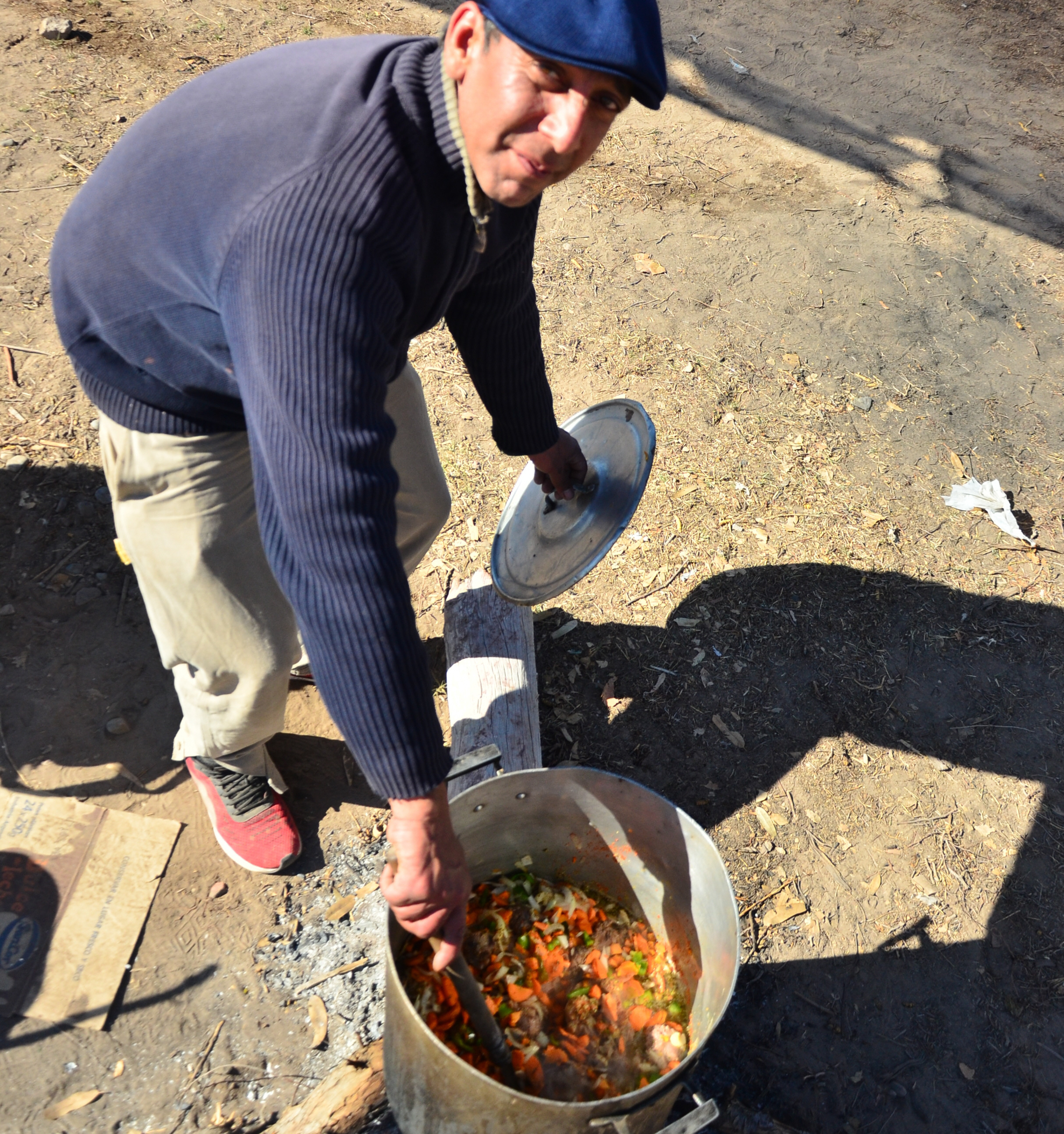 La agrupación Marcelo Montaña, de Ullum, rompió con el paisaje gastronómico, en el que detrás de cada estandarte identificatorio, una parrilla cocinaba el menú del almuerzo. Américo Montaña preparó para sus comensales un puchero al vino que atrajo a varios curiosos.