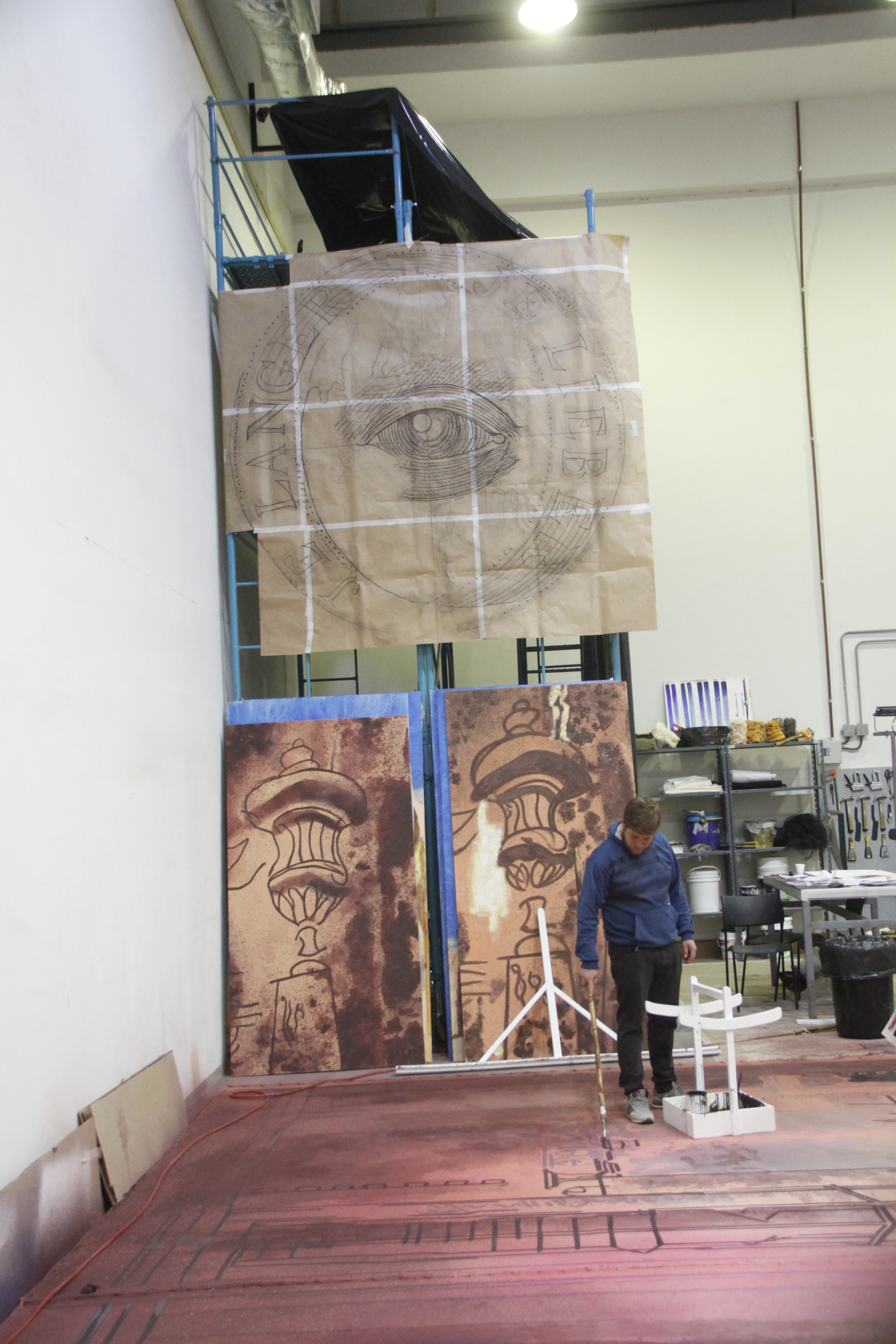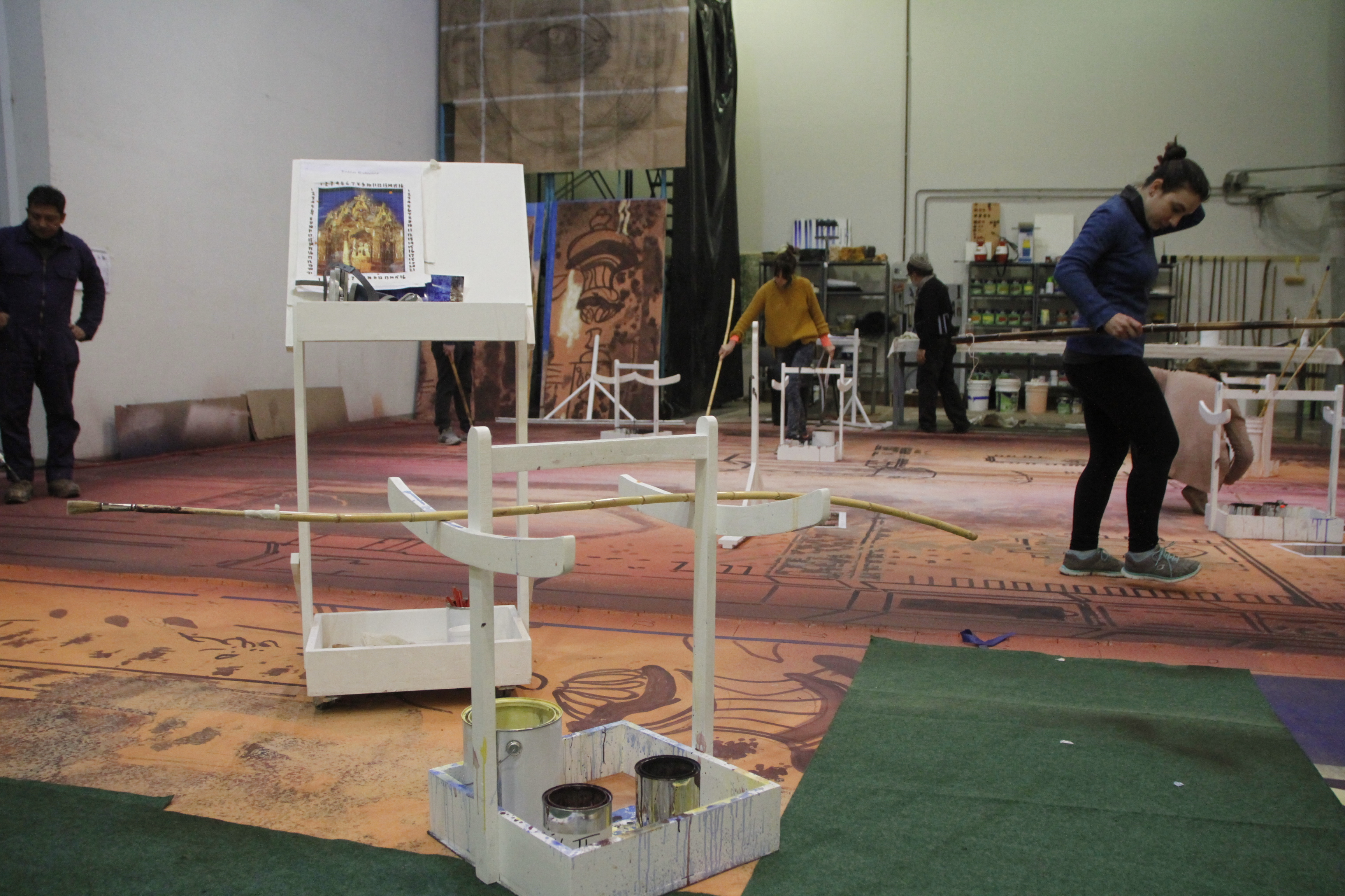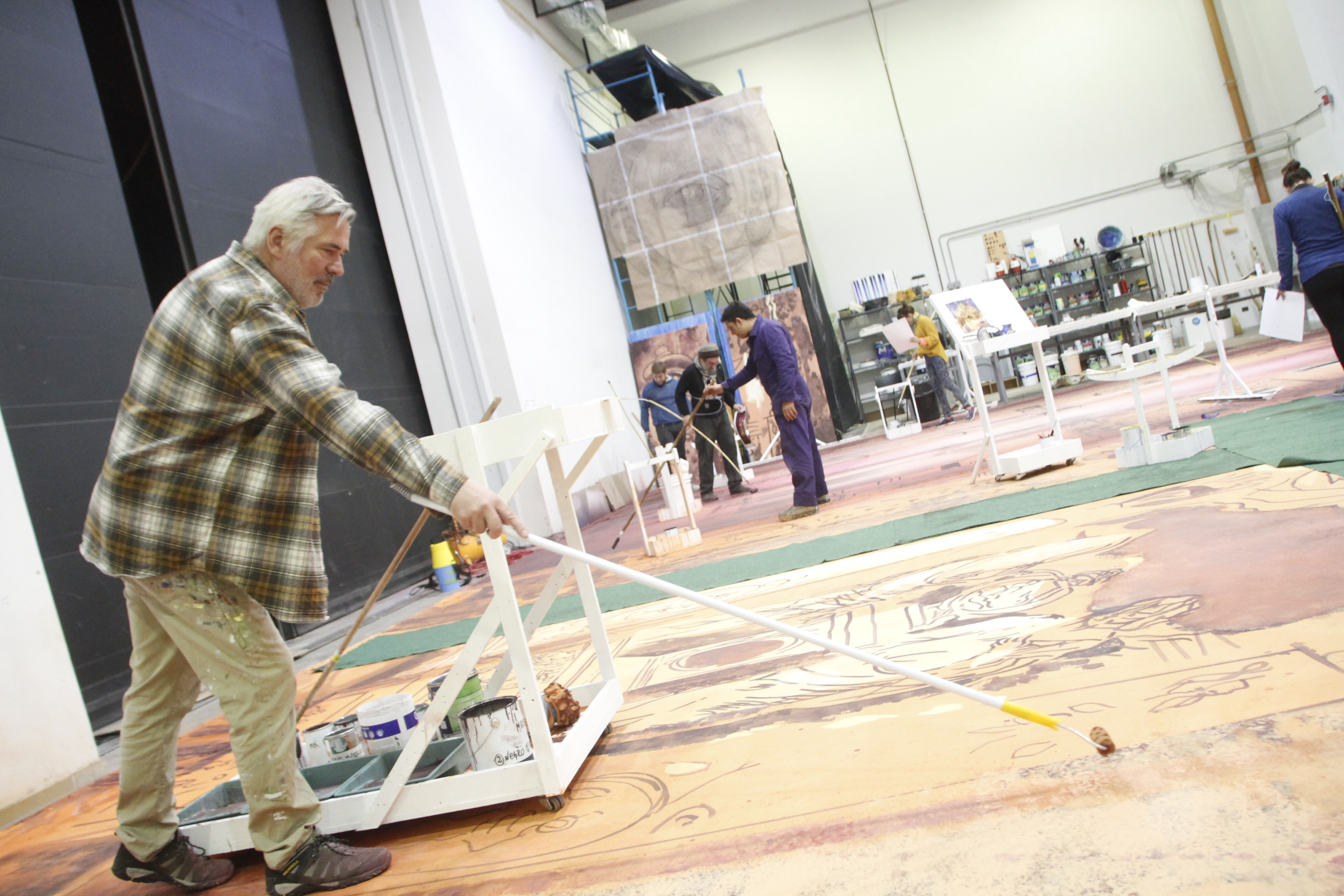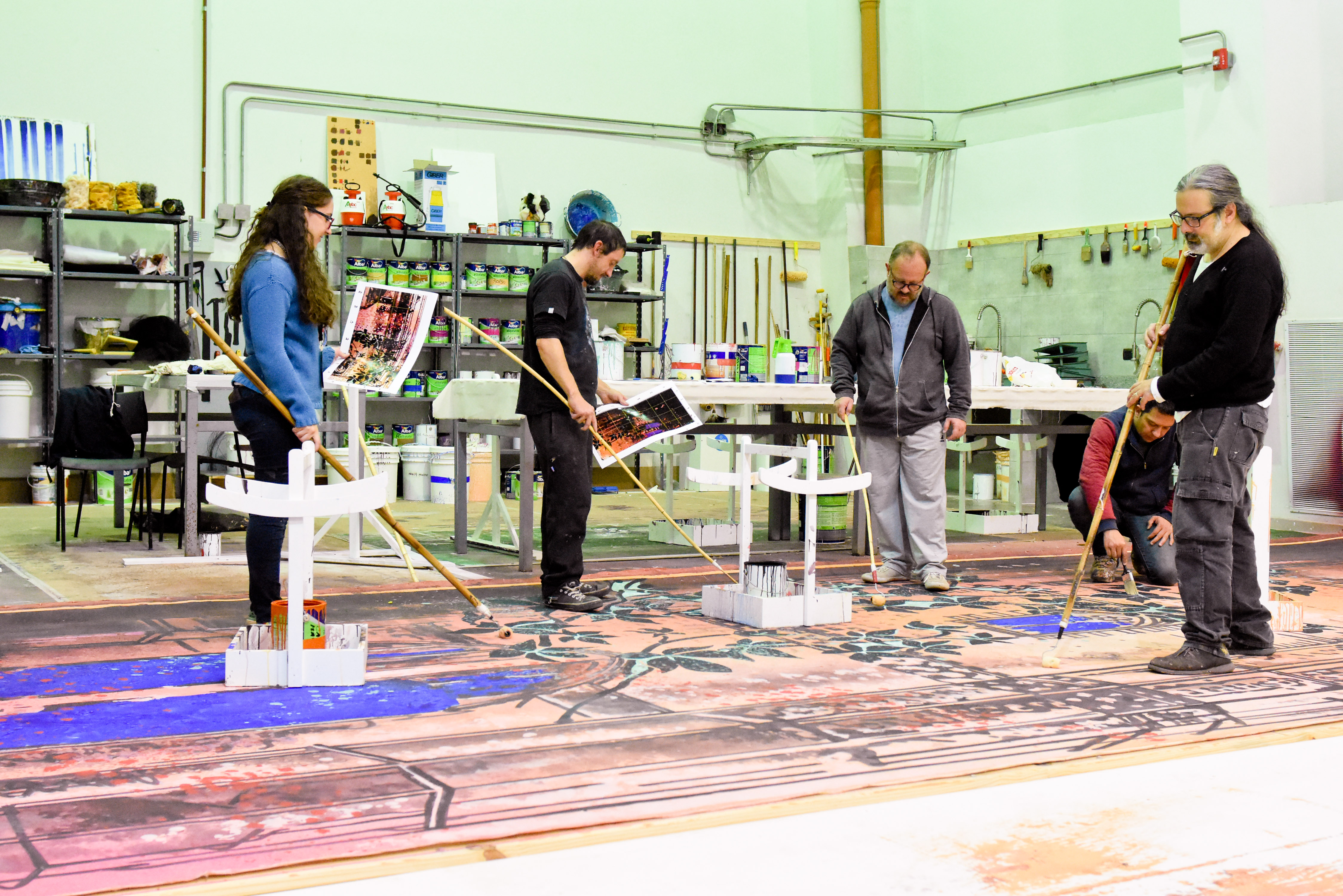 "Todo lo que hicimos antes nos preparó para esto", dijo Cristian Guajardo, director operativo del Bicentenario en relación a la tarea de producción que encaran por primera vez. Él trabaja para la logística necesaria para este taller creativo, como estar al tanto de la tela necesaria (que tiene que ser liviana porque luego se vuelve pesada con la pintura, dice) o los litros de pintura al agua que utilizan los pintores en esta monumental tarea, que está al nivel de los grandes teatros del mundo.
