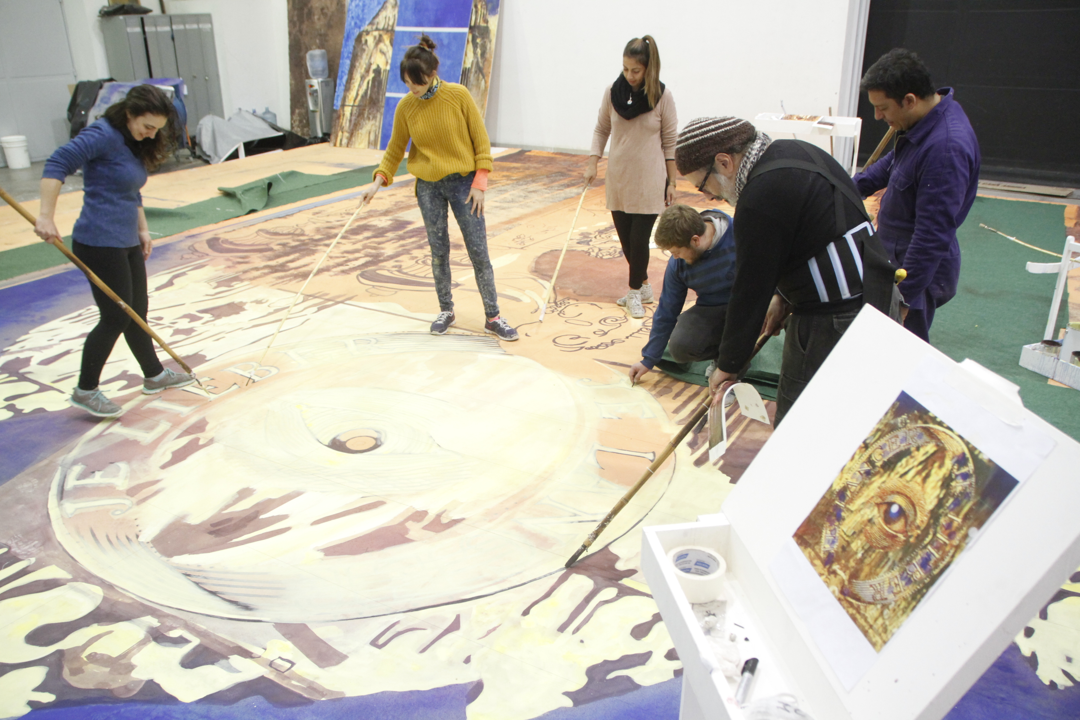 Todo el dibujo de base se hace a mano alzada y luego comienzan a colorear. Aunque hay algunas maderas que sirven de reglas para los trazos rectos, Ahmer prefirió que no las usaran para darle otro carácter. Algunos dibujos más complejos se calcaron desde un boceto realizado en papel, usando una herramienta (un pounce pattern) que hace microperforaciones y que va dejando un rastro de polvo de carboncillo. "Es una técnica que usó Miguel Ángel en sus diseños", explicó Gunnar. La razón de calcarlo así es que permite cuidar las proporciones del dibujo para luego transferirlo al lienzo ubicado horizontalmente.