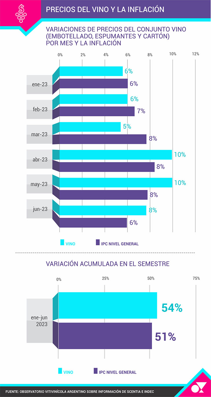 Según un informe elaborado por el Observatorio Vitivinícola Argentino (OVA), en base a valores relevados a nivel país en hipermercados, supermercados y autoservicios por la consultora Scentia, los precios del conjunto Vino, aquí entran en un promedio los embotellados, espumantes y los que se venden en caja de cartón, subieron en el acumulado de los primeros seis meses del 2023 un 54% en relación a diciembre último. En este mismo período, la inflación general de precios de enero a julio acumulada asciende al 51%, según el relevamiento a nivel país del INDEC.