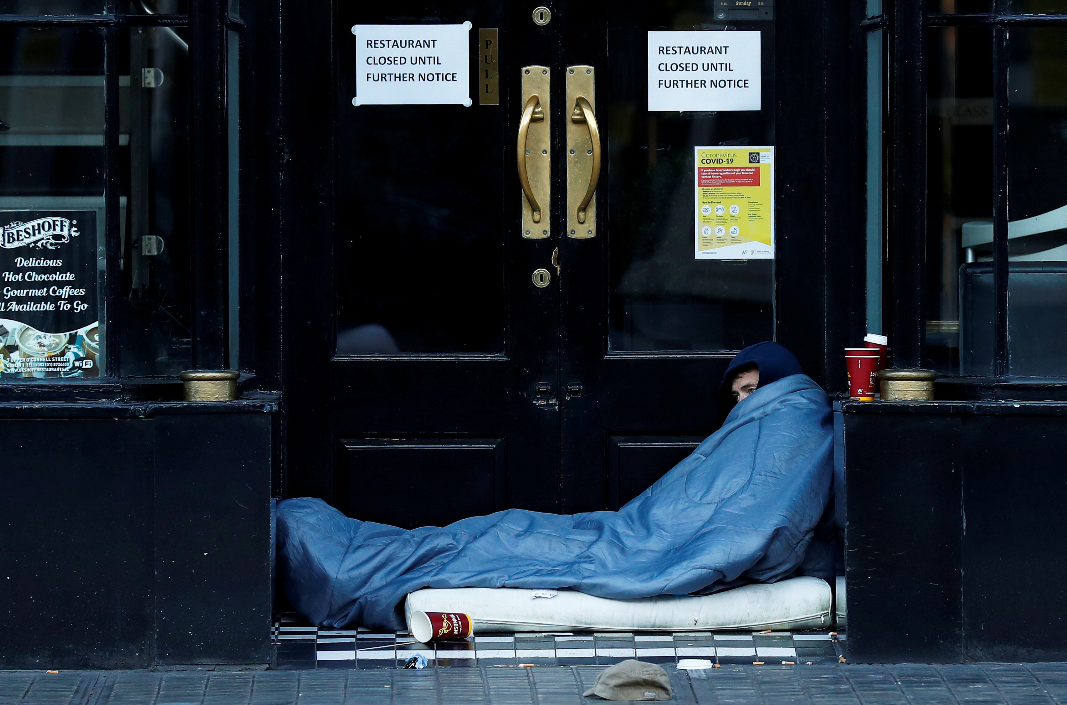 Una persona sin hogar duerme en la puerta de un restaurante en Irlanda, mientras se propaga el coronavirus al igual que en el resto del mundo. Las autoridades irlandesas decidieron pagar 70% del sueldo a empleados en riesgo.