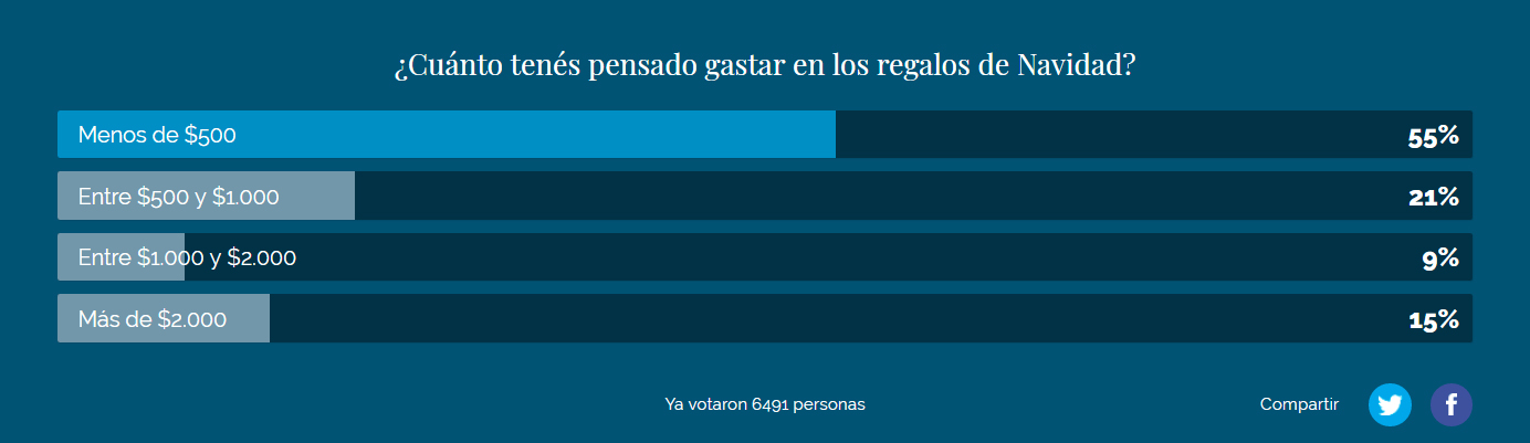 Es que de acuerdo a un sondeo de DIARIO DE CUYO, del que participaron 6.491 lectores, la mayoría se inclinó por hacer un gasto para el regalo de Navidad de no más de $ 500 que, teniendo en cuenta el valor de las cosas, resulta más que escaso.