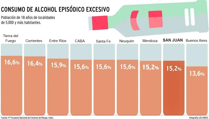 San Juan se encuentra entre las provincias que más se exceden en el consumo de alcohol, de acuerdo a la IV Encuesta de Factores de Riesgo (ENFR), realizada por el ministerio de Salud de la Nación. El porcentaje de mayores de 18 años que tomaron cinco tragos o más en una misma oportunidad en los últimos 30 días es de un 15,2%, al igual que ocurre en Mendoza.