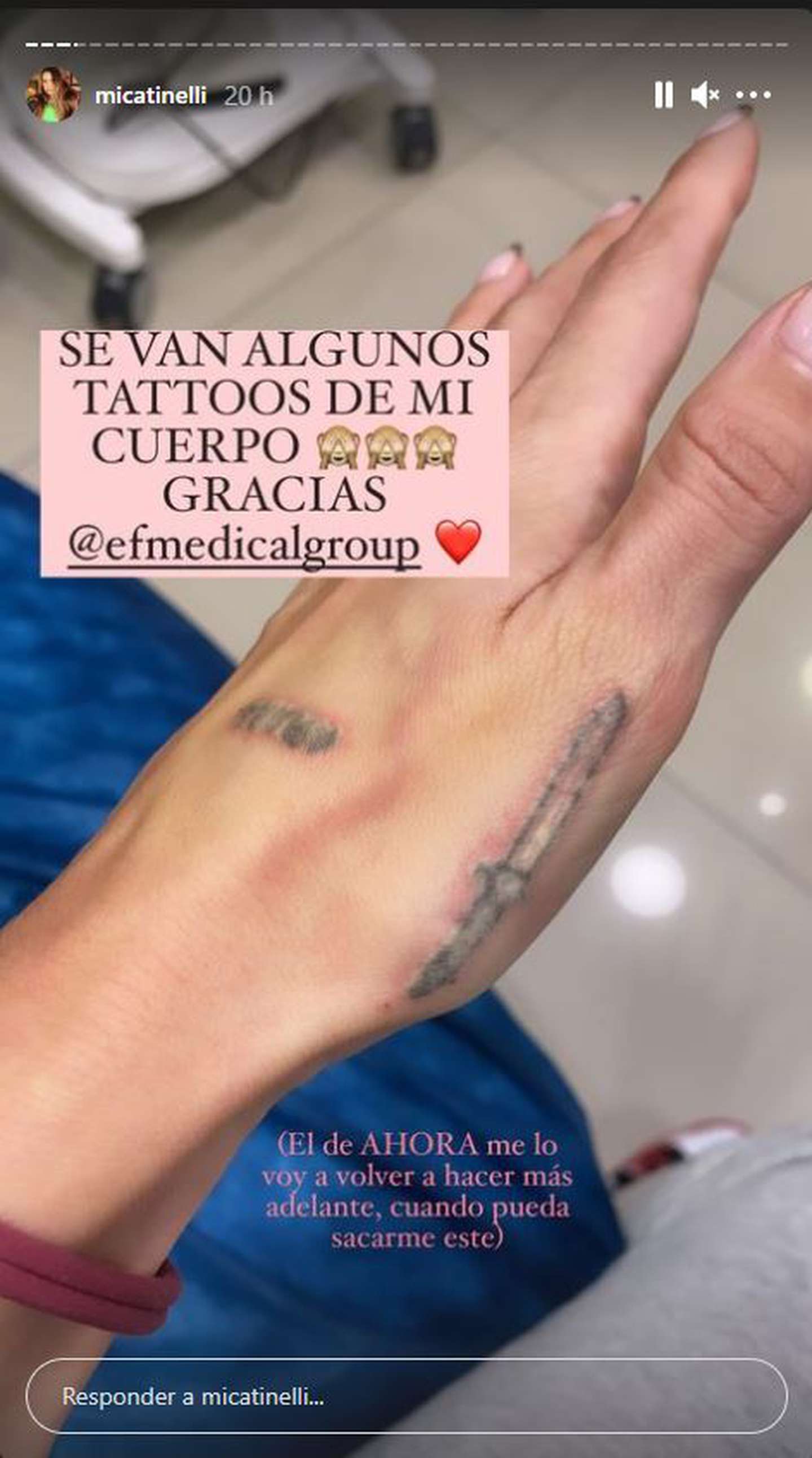 En mayo Micaela Tinelli anunció: “Se van algunos tattoos de mi cuerpo…”. Con el mensaje publicó la foto de una de sus manos con dos tattoos en pleno proceso de borrado. En uno se veía una espada y en otro se leía la palabra “ahora”, que advirtió que volverá a inscribírsela más adelante.