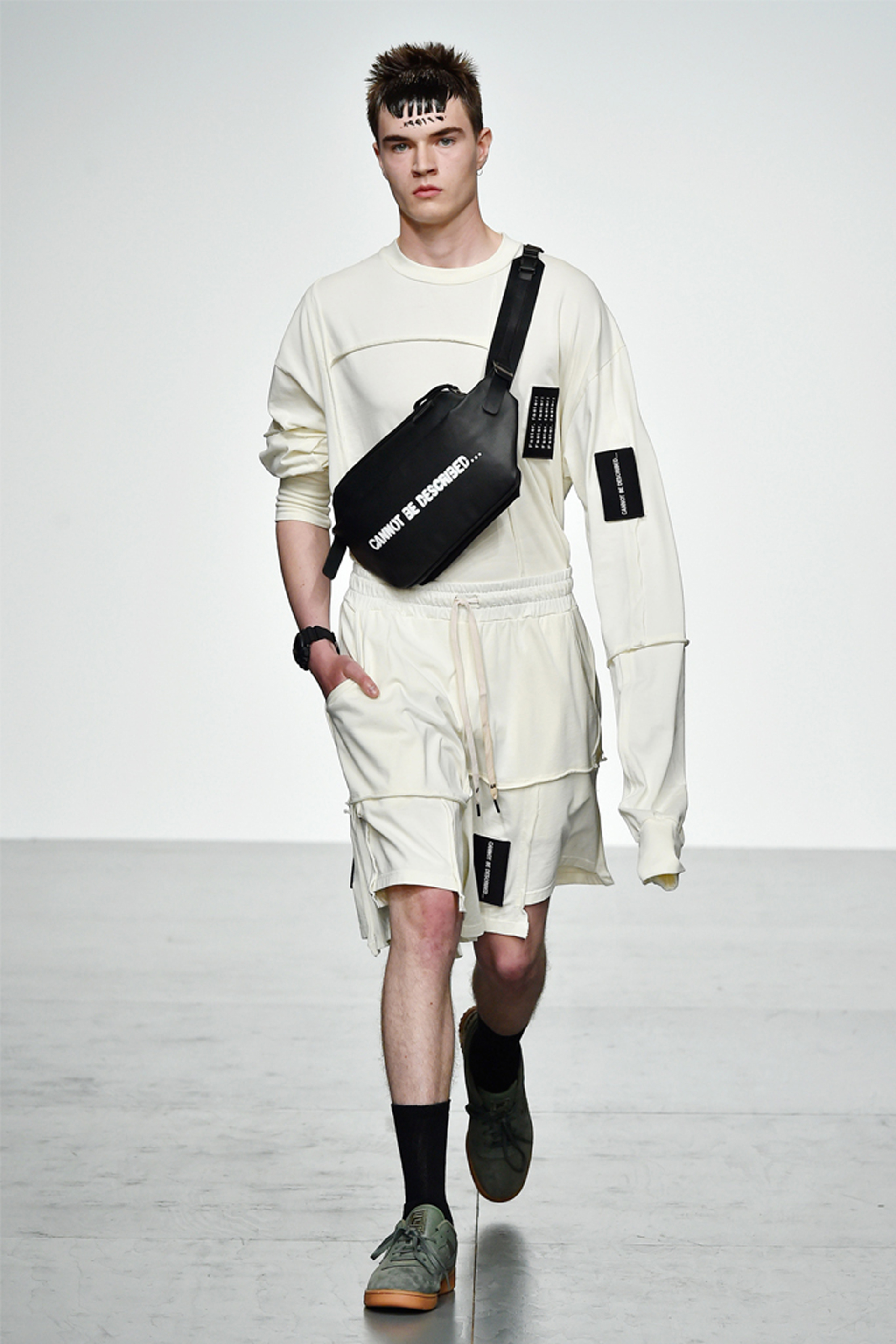 Inspirado en el movimiento punk y colores army, la marca inglesa KTZ presentó unos borcegos con tachas y pinches. Liam Hodges, más clásico, con unas sneakers bicolor para resaltar el look oversize black and white.