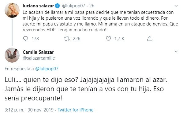 “Lo acaban de llamar a mi papá para decirle que me tenían secuestrada con mi hija y le pusieron una voz llorando y que le lleven todo el dinero”, denunció Luciana a través de su cuenta e Twitter. “Por suerte mi papa es astuto y me llamó. Mi mamá en un ataque de nervios. Que reverendos HDP. ¡Tengan mucho cuidado!”, advirtió.