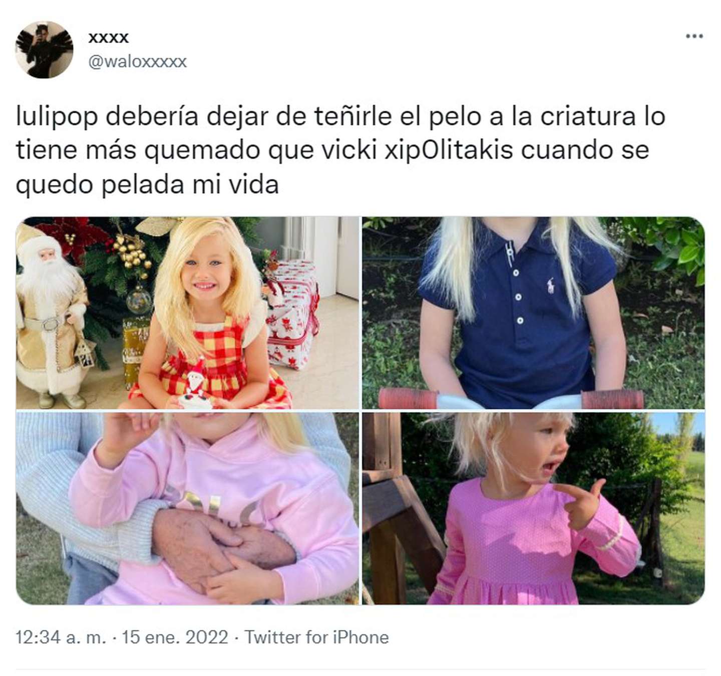 El comentario que desató su furia fue publicado por una usuaria en Twitter. “Lulipop debería dejar de teñirle el pelo a la criatura… Lo tiene más quemado que Vicky Xipolitakis cuando se quedó pelada, mi vida”, decía el tuit en referencia a Matilda, la hija de 4 años de la mediática.