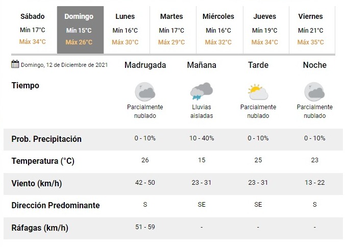 La página digital del tiempo prevé que para esta noche haya tormentas aisladas y viento del sudeste pero durante la madrugada del domingo es cuando se desarrollará el fenómeno más violento, ya que habrá ráfagas del sur que oscilarán entre los 51 y 59 km/h.