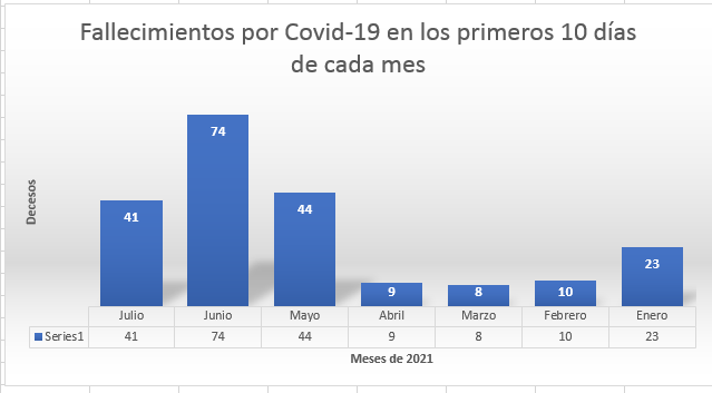 En lo que va de julio, se registraron 41 decesos, es decir un 55% a comparación del registro anterior. Estos 41 casos son incluso una cifra inferior a los 44 fallecimientos durante los primeros 10 días de mayo. De todos modos se ubica en el tercer puesto, en estos 7 meses, siendo un 512,5% superior al registro más bajo, los 8 decesos ocurridos en los 10 primeros días de marzo.