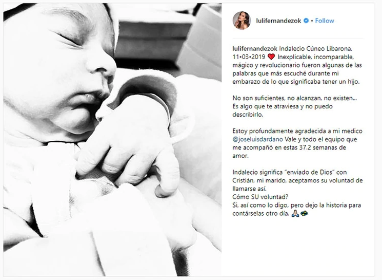 El nuevo integrante nació el lunes, en la semana 37 de embarazo, y el parto fue por cesárea. La noticia llamó la atención de todos, pero más que nada revolucionó las redes por el particular nombre que decidieron para el bebé: Indalecio Cúneo Libarona. Sin embargo, los padres lo eligieron sobre todo por su significado, "enviado de Dios", tal como explicó la modelo en las redes.