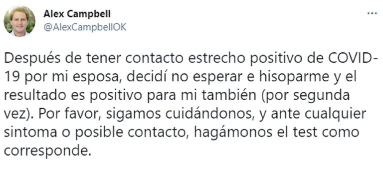 “Después de tener contacto estrecho positivo de COVID-19 por mi esposa, decidí no esperar e hisoparme y el resultado es positivo para mi también (por segunda vez)”, reveló esta tarde Alex Campbell a través de las redes sociales.
