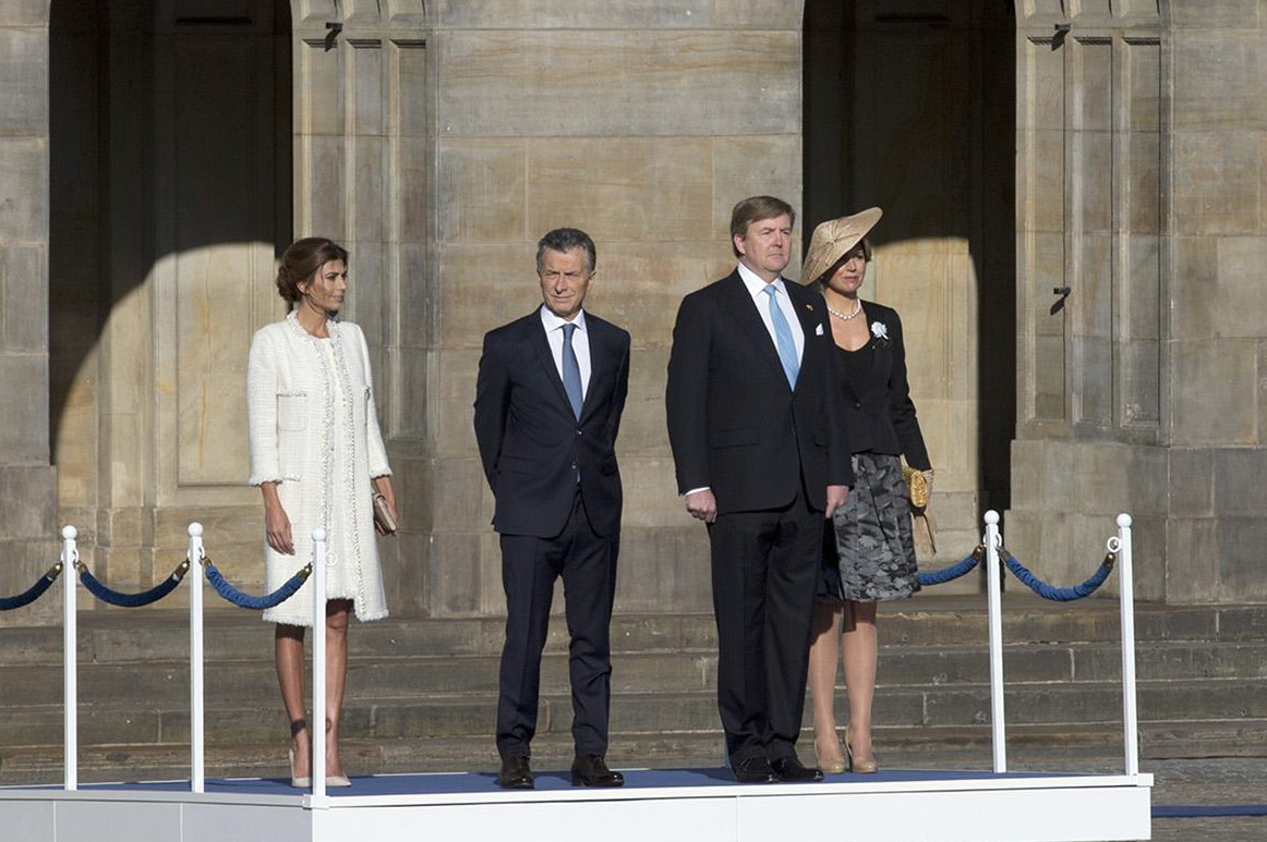 Por la mañana, Macri y la primera dama, Juliana Awada, fueron recibidos con honores por los reyes de Holanda, Willem-Alexander y la argentina Máxima Zorreguieta, en la céntrica plaza Dam de Amsterdam, al inicio de su visita de Estado al país europeo, entre gritos de apoyo y de rechazo de manifestantes argentinos. Puntuales, como marcaba el protocolo, el matrimonio presidencial y la pareja de soberanos salieron caminando juntos por una de las puertas principales del Palacio Real, situado en la misma plaza, y se dirigieron a un podio desde donde siguieron la ceremonia. Una veintena de manifestantes de la agrupación H.I.J.O.S. entonó consignas contra el jefe de Estado, tales como ‘Macri: hunger (hambre)‘. Un similar número de argentinos salió al cruce, entonando “Sí, se puede”.